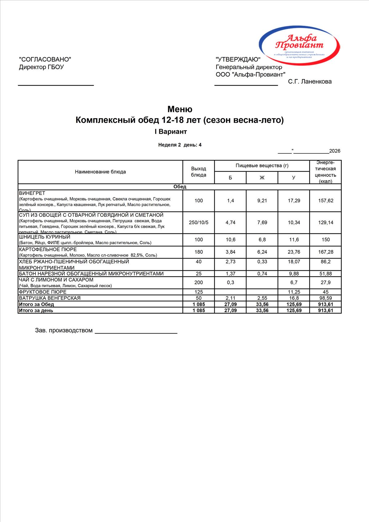 Цикличное двухнедельное (12 дней) сбалансированное меню рационов горячего питания для обеспечения льготным питанием детей в школах Калининского района Санкт-Петербурга. Приведенные меню различаются для детей начальных и средних-старших классов.