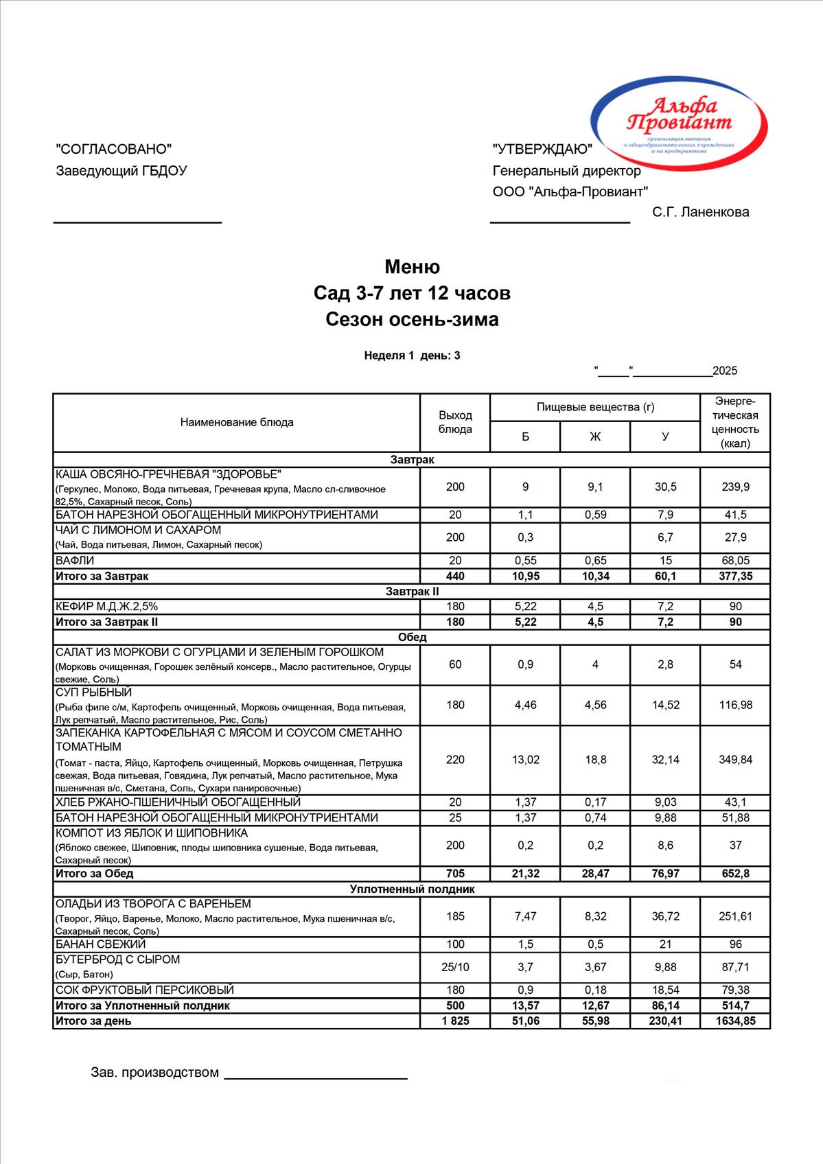 Меню групп детского сада возраста 3 - 7 лет с размещением детей на 12 часов - 10 стр.