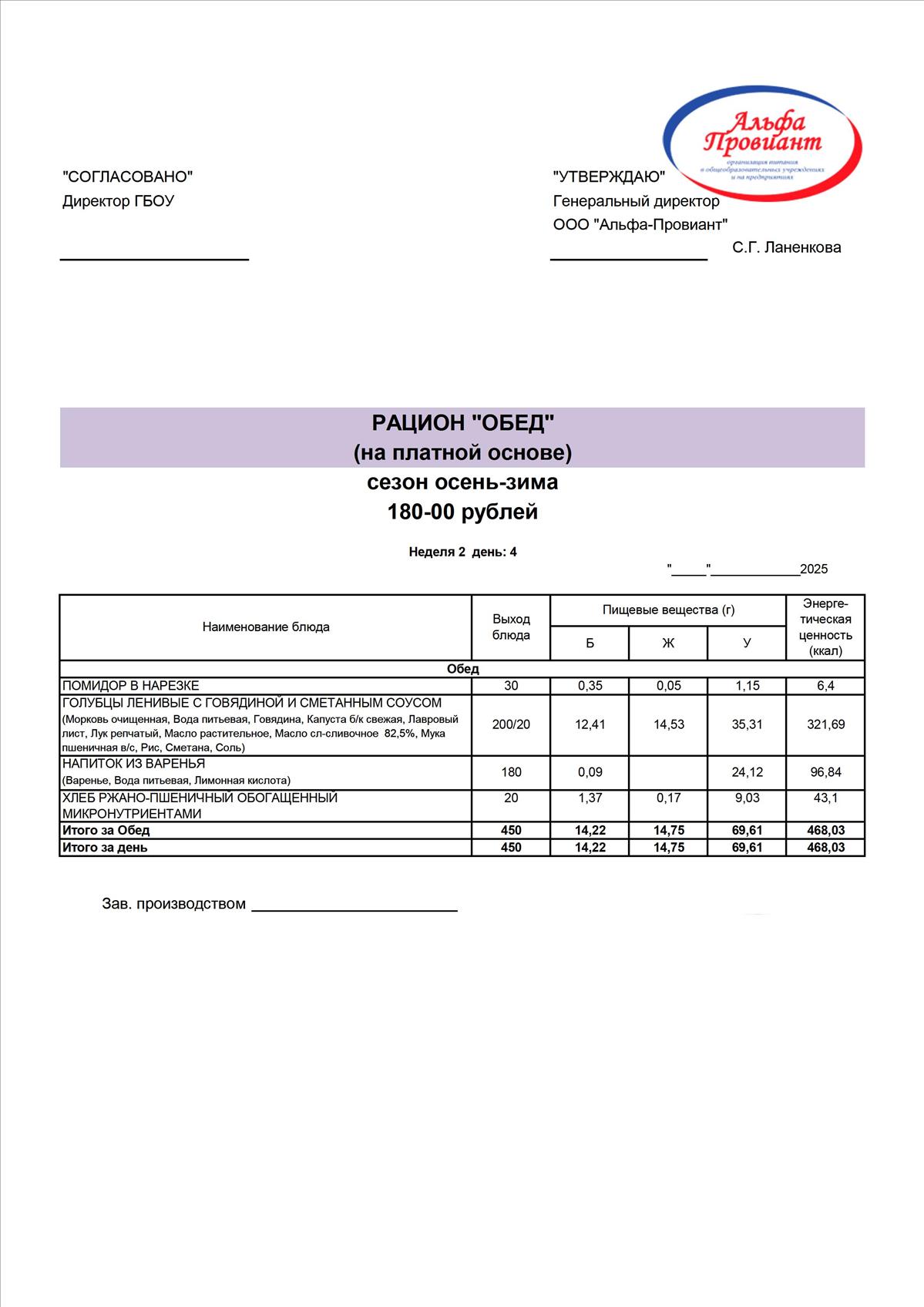 Цикличное двухнедельное (12 дней) сбалансированное меню комплексных рационов питания в столовых школ Калининского района Санкт-Петербурга. Питание предоставляется на платной основе