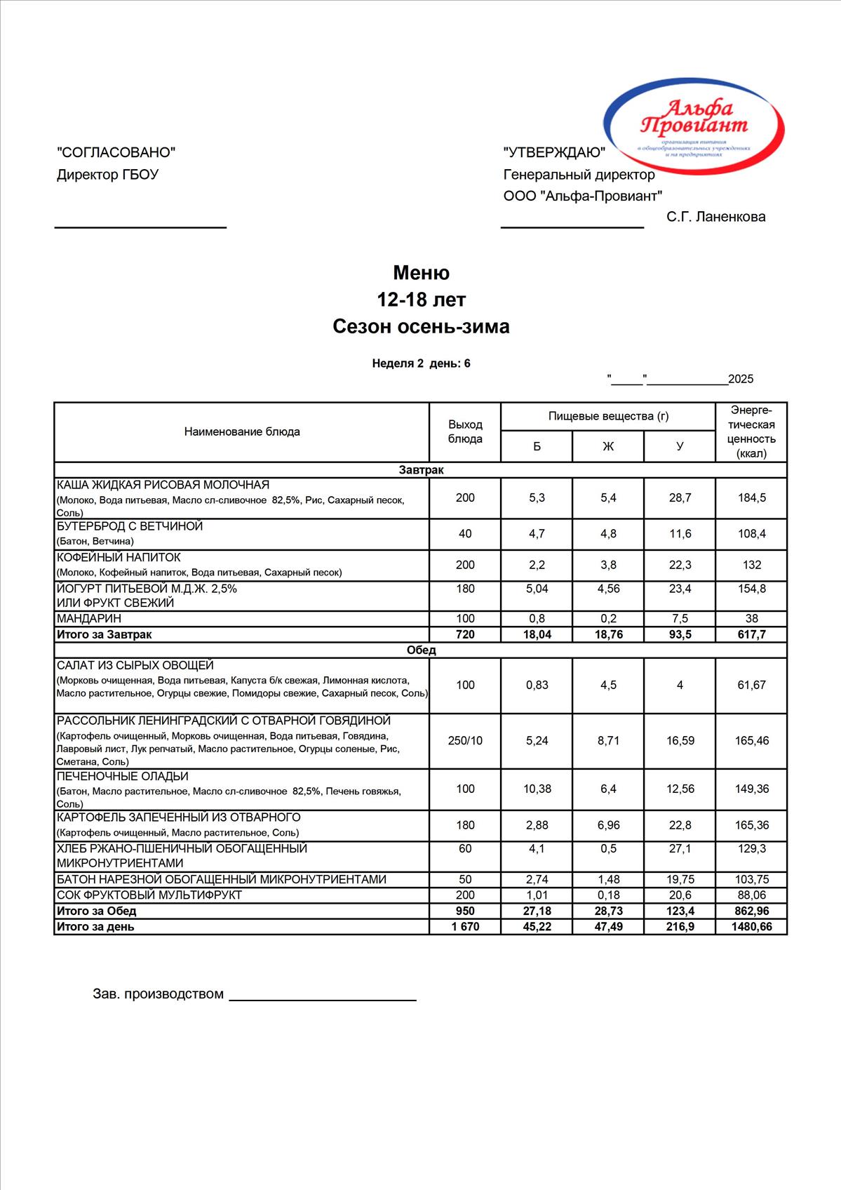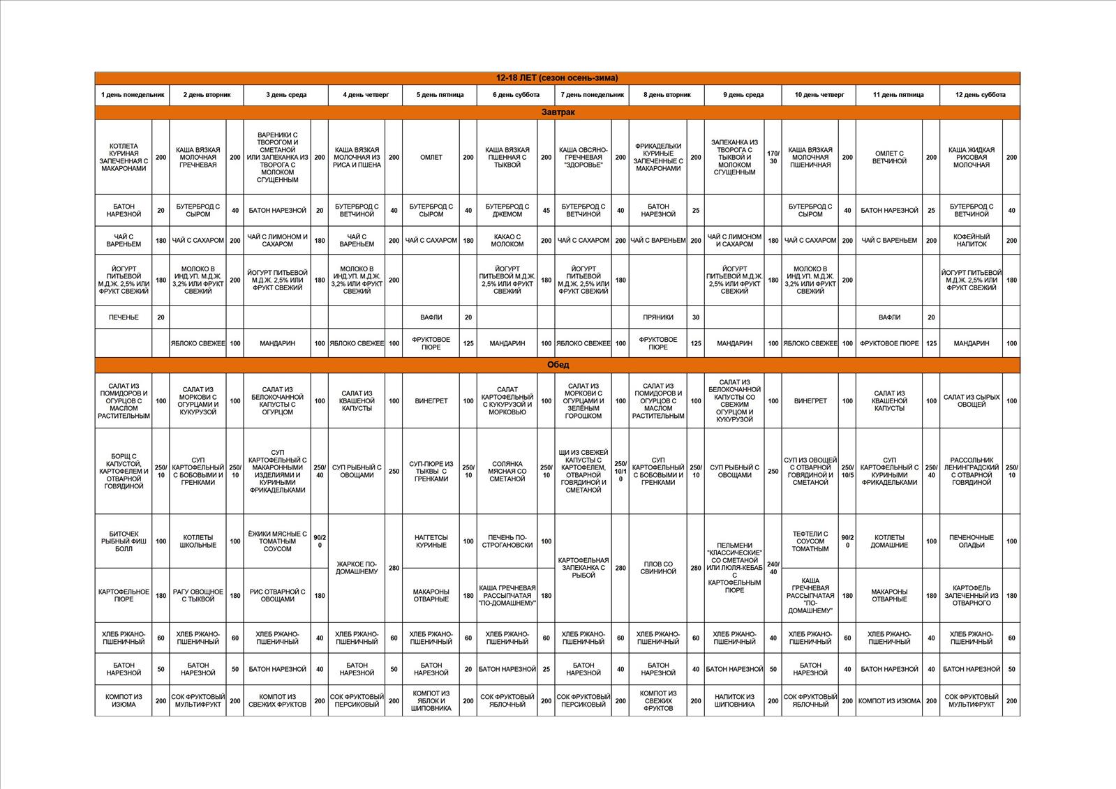 Цикличное двухнедельное (12 дней) сбалансированное меню рационов горячего питания для обеспечения льготным питанием детей в школах Калининского района Санкт-Петербурга. Приведенные меню различаются для детей начальных и средних-старших классов.