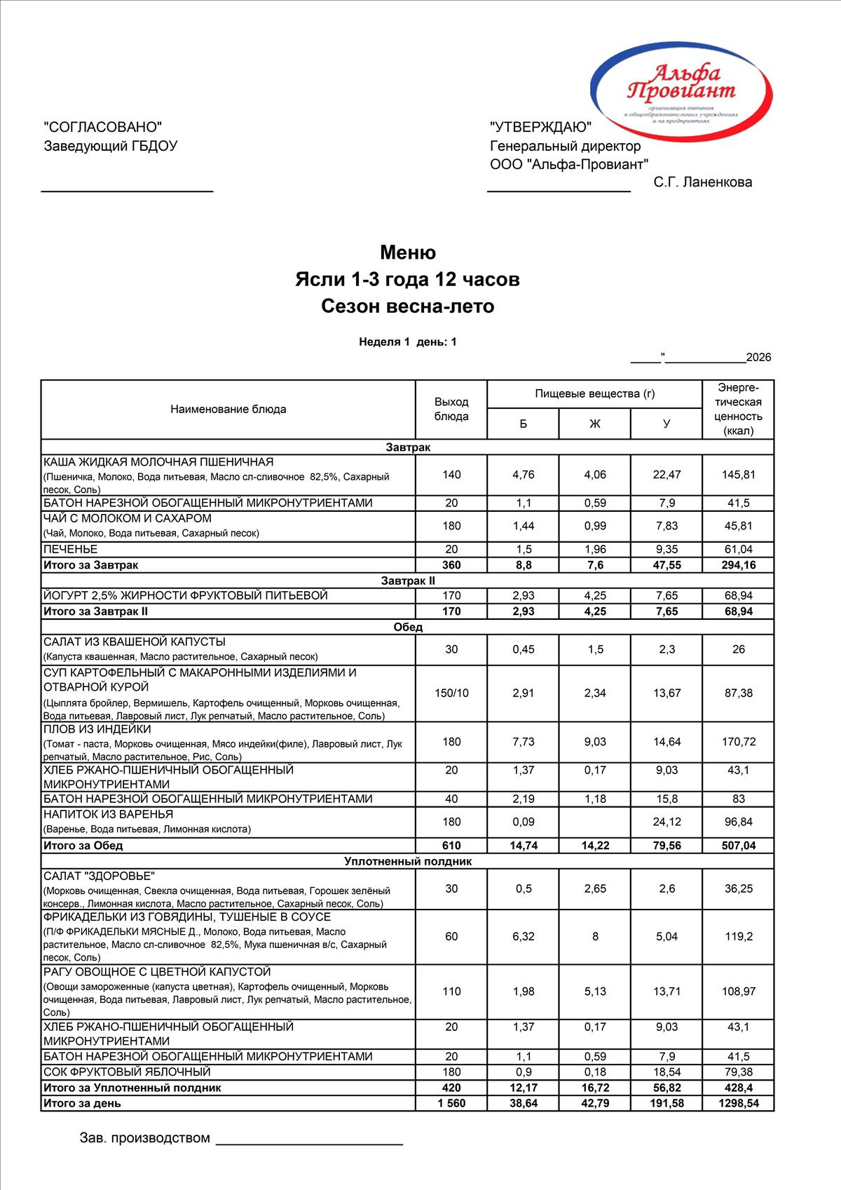 Цикличное двухнедельное (10 дней) сбалансированное меню рационов горячего питания для обеспечения льготным питанием детей дошкольных учреждений Калининского района Санкт-Петербурга. Приведенные меню различаются для групп детей ясельного и детсадовского возраста, а также зависят от времени работы дошкольного учреждения - 12 часов или круглосуточно.