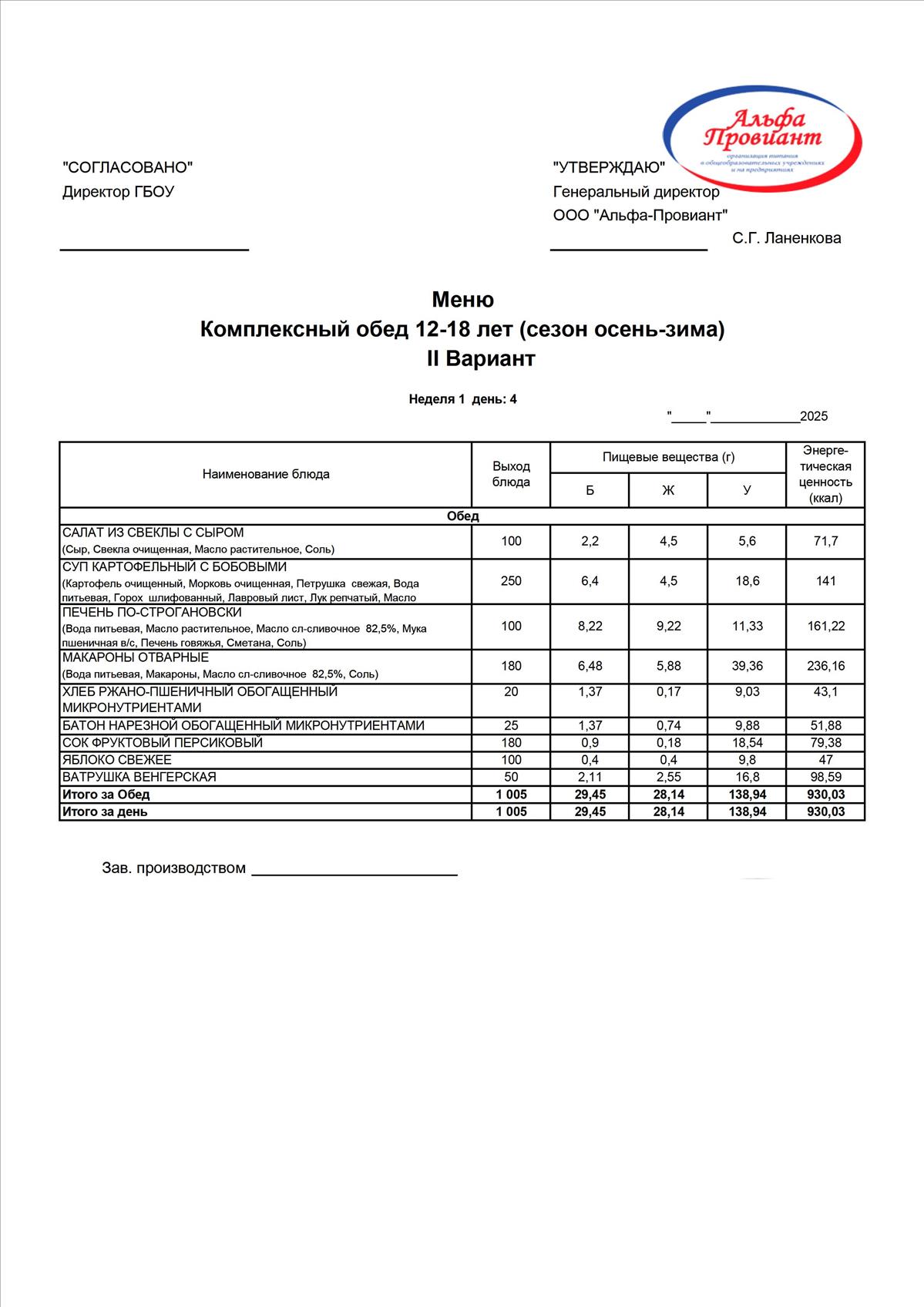 Цикличное двухнедельное (12 дней) сбалансированное меню рационов горячего питания для обеспечения льготным питанием детей в школах Калининского района Санкт-Петербурга. Приведенные меню различаются для детей начальных и средних-старших классов.