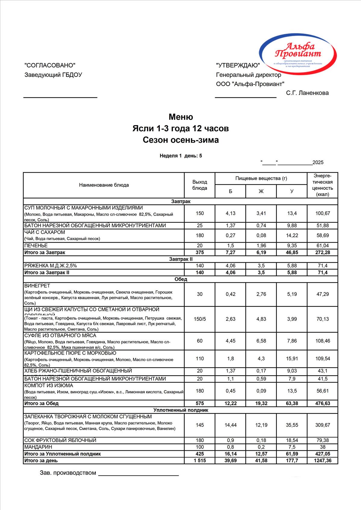Цикличное двухнедельное (10 дней) сбалансированное меню рационов горячего питания для обеспечения льготным питанием детей дошкольных учреждений Калининского района Санкт-Петербурга. Приведенные меню различаются для групп детей ясельного и детсадовского возраста, а также зависят от времени работы дошкольного учреждения - 12 часов или круглосуточно.