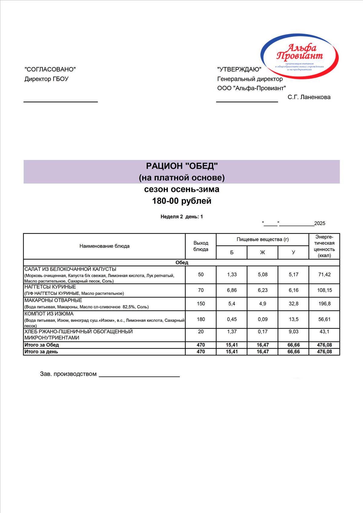 Цикличное двухнедельное (12 дней) сбалансированное меню комплексных рационов питания в столовых школ Калининского района Санкт-Петербурга. Питание предоставляется на платной основе